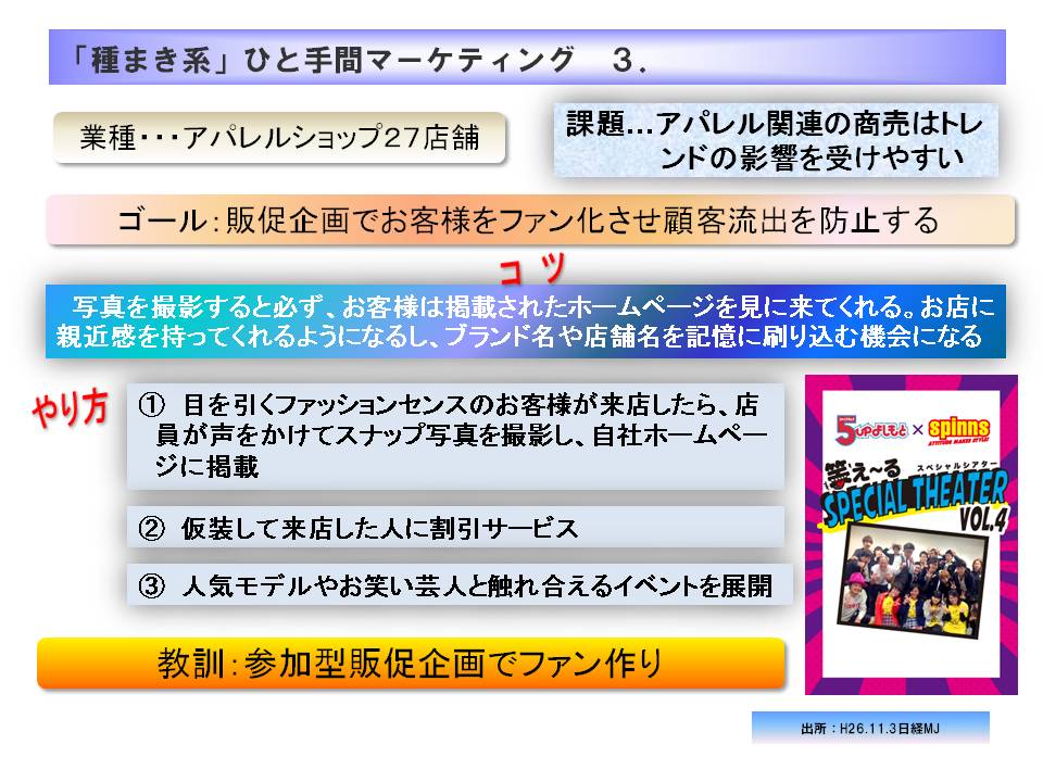 少し前(H26年11月3日)の日経MJの記事(マーケティングコンサルタント竹内謙礼さんの「顧客をキャッチ」というコラム)ですが、株式会社ヒューマンフォーラム(京都市中京区)が運営するカジュアルブランド「スピンズ」さんの取組をご紹介しましょう・・・。