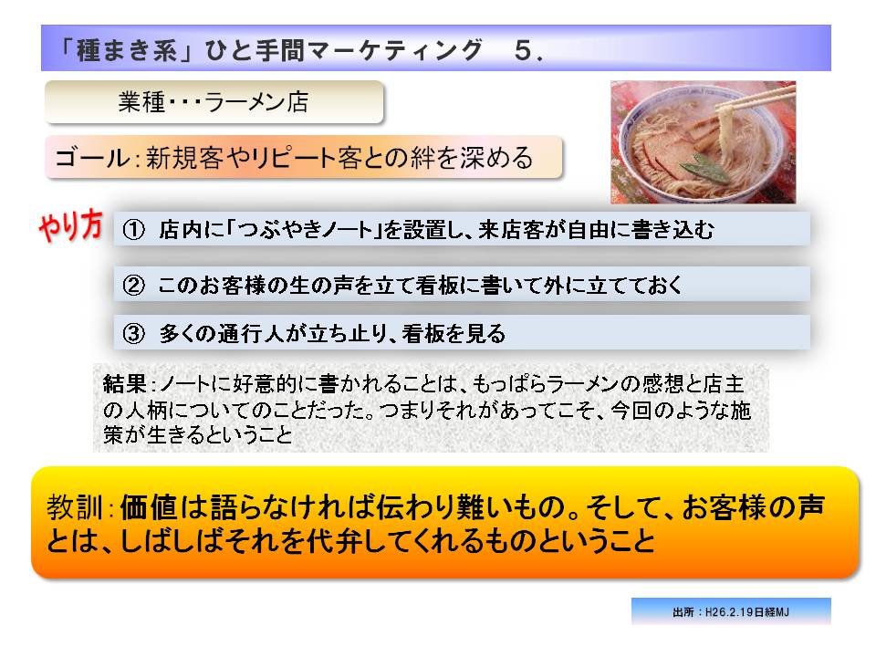 少し前(H26年2月19日)の日経MJの記事(小阪裕司さんの「招客招福の法則」というコラム)ですが、都内でラーメン店を営む方が取り組んだはなしをご紹介しましょう・・・。