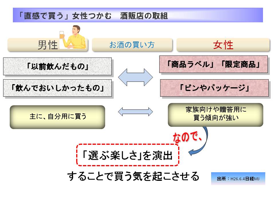 女性にお酒を買ってもらうには商品の中身はもちろんですが、パッケージのデザインやフレーズを工夫することも大事なようです。最近話題の商業施設に入居している酒販店ではこうした女性の特性をとらえたお店づくりが目立つそうです。