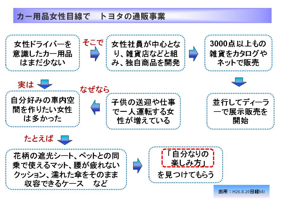 トヨタは昨年、女性社員6人が中心となってカー用品の通販事業「ハピカラ」を発足させたそうです。3千点以上もの雑貨をカタログやネットで販売し、花柄の遮光シートやペットとの同乗で使えるマット、腰が疲れないクッションなど従来のカー用品と異なる商品を扱っています。