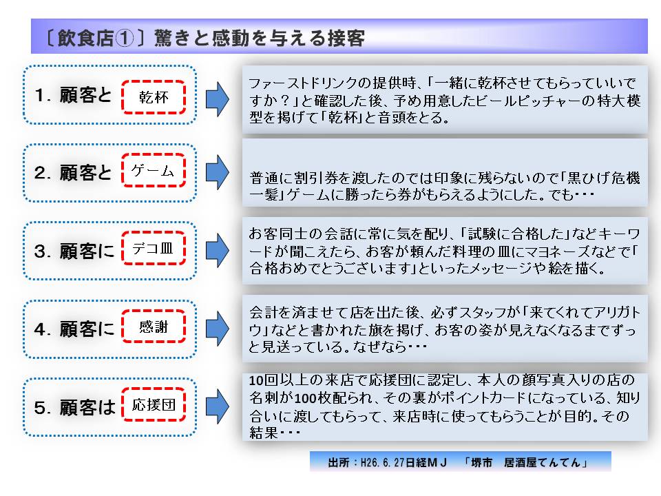5.お客様は応援団 10回以上来店したお客様は店の「応援団」と認定し、2カ月に1回の応援団限定の飲み会(参加費3,000円)に参加できる。発売前に食べられる新作料理を用意しており、お客様に特別完を与えている。ほかにもお花見やバーベキューなど応援団メンバー限定のイベントを年2~3回開催。そうしたイベントはお客様とスタッフ、さらにはお客様同士の「絆づくりがの目的」。応援団は現在、約100人。応援団のメンバーには、本人の顔写真入りの店の名刺が100枚配られ、その裏がポイントカードになっている、知り合いに渡してもらって、来店時に使ってもらうことが目的。およそ新規客の2割がその名刺を持って来店しているという。