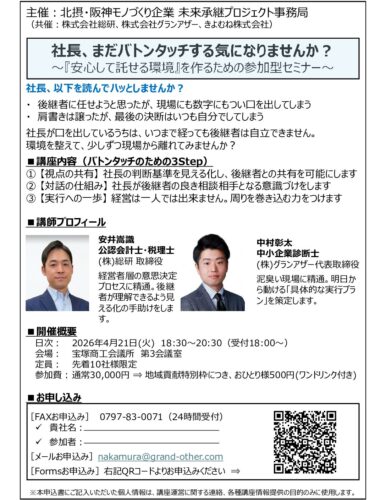 セミナー開催のお知らせ 2026年4月10日 | コメントはまだありません | コラム 事業承継をと思っていても、なかなか一歩踏み出せない。 そんな現社長に一歩踏み出していただけるようなセミナーを開催いたします。 後継者候補の方と共にご参加いただき、様々な視点から、「わからない」を解消します。 (株)グラン […] もっと読む »